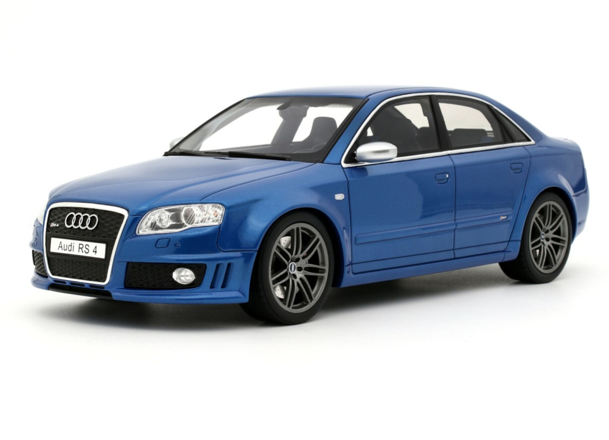 AUDI RS 4 B7 SEDAN SPRINT BLUE 2007 OttO mobile 1:18 Resinemodell (Türen, Motorhaube... nicht zu öffnen!)