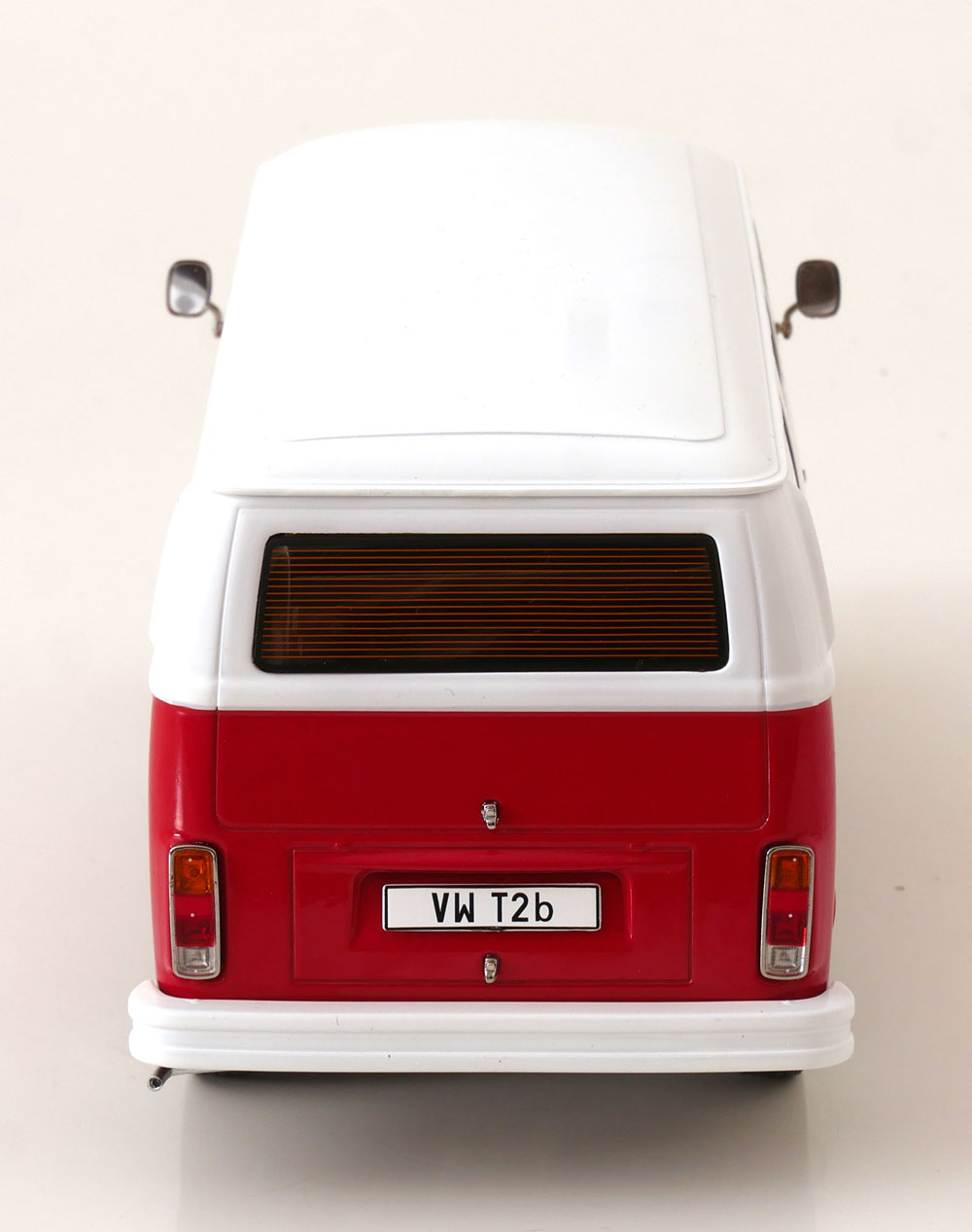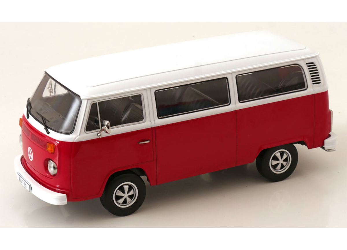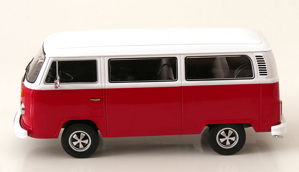 VW Bus T2b Bus rot/weiß 1972 mit Fuchs-Felgen KK-Scale 1:18 Metallmodell (Türen, Motorhaube... nicht zu öffnen!)