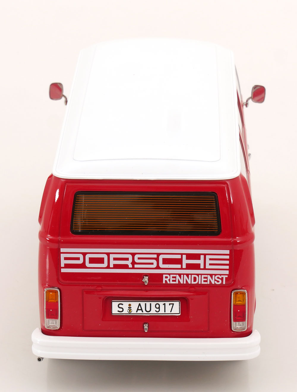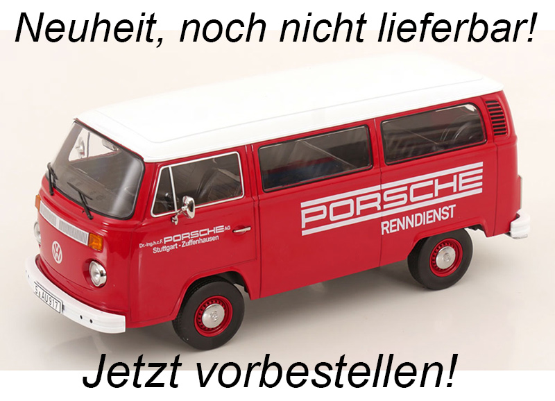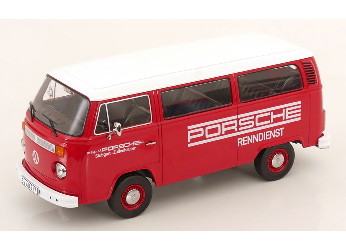 VW T2b Bus 1972 rot/weiß Porsche Renndienst KK-Scale 1:18 Metallmodell (Türen, Motorhaube... nicht zu öffnen!)