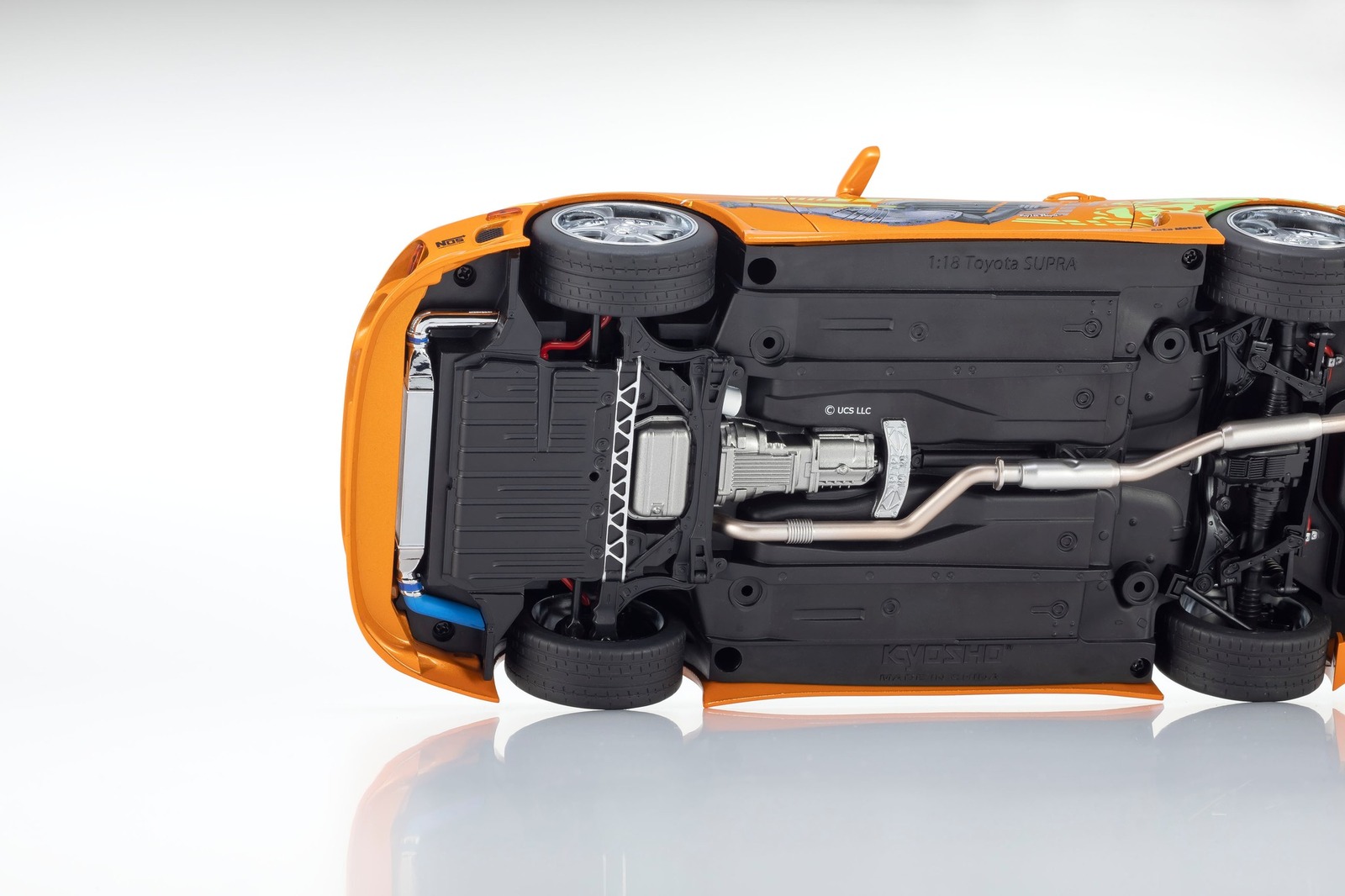 A defining feature of the FAST & FURIOUS hero cars is the NOS (Nitrous Oxide System) that delivers an explosive surge of power with direct injection of nitrous oxide into the engine. Nitrous tanks are mounted in the luggage compartment